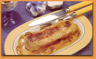 4 personnes : 4 andouillettes, 1 gros oignon, 4 pommes de terre moyennes, 1 petit céleri-rave, 1,5 l de bouillon de volaille léger (préparé avec du concentré), 2 cuillères à soupe de vin blanc sec,2 cuillères à soupe d'huile, 70 g de beurre, sel, poivre. Préparation et Cuisson : 45 minutes |