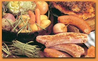 : 30 minutes Cuisson : 1 h 30 Pour 6 personnes : 1 palette de porc demi-sel, 600 g de poitrine demi-sel, 1 saucisse à cuire, 1 chou vert, 6 carottes, 6 navets, 1 coeur de céleri-branches, 6 pommes de terre, 300 g de haricots verts, 3 oignons, 2 clous de girofle, 1 bouquet garni, sel, poivre. |